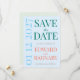 Celebre seu próximo casamento com este cartão de aviso prévio arejado em azul céu pálido com acentos turquesa e coral. O design contemporâneo apresenta numerais de data superdimensionados criando um fundo sutil para uma tipografia azul-teal limpa e detalhes de roteiro arenoso e quente. Perfeito para casamentos na praia, celebrações à beira-mar ou casais que amam paletas de cores frescas e inspiradas no oceano.