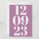 Um estilo contemporâneo para Convidar seus convidados a salvar sua data de casamento com este design tipográfico moderno, com sua data de casamento como um fundo sutil em forma numérica preenchendo a página de cima para baixo em massa pálida, que é repetida do outro lado em um fundo mauve mais escuro. Na frente, uma pequena tipografia simplista de mauve escura é sobreposta em cima dos números com seus detalhes. O texto é facilmente personalizado, incluindo os números de fundo que se alterarão simultaneamente de ambos os lados. Você também pode mudar as cores do texto e do plano de fundo para melhor se adequar ao seu esquema de cor do casamento, se quiser através da opção personalizar mais. Se precisar de ajuda com isso, por favor, me mande mensagem.