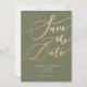 Casamento elegante e simples guarde o cartão de data. O texto da tipografia manuscrita é dourado esbatido contra fundo verde-oliva.