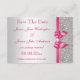 Cartões personalizados de Save The Date para casamento. Elegantes cartões de notas formais cor-de-rosa quente e prata personalizados, planos, duplos-faces, com um lindo padrão brilhante de lantejoulas glitter impressas, laços e fitas vetoriais brilhantes impressos e uma imagem estilosa e bonita de diamantes brilhantes e joias e um texto cor-de-rosa quente groovy num fundo gradiente prateado. Estes cartões de notas formais, glamorosos, da moda, cor-de-rosa quente e prata, são decorados em ambos os lados e impressos no papel de convite de sua escolha. Cartões duplos-faces bonitos, chiques, modernos, com brilho e glamour femininos. Por favor, note: Todos os convites na Zazzle têm imagens impressas planas. Tenho produtos combinando para casamentos na minha loja. O texto, a fonte e as cores da fonte são todos personalizáveis para atender às suas necessidades. Se precisar de ajuda para personal