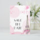 Personalize este elegante tema Paris Salvou o cartão de data para o seu próprio evento. A carta apresenta uma ilustração aquosa da Torre Eiffel em ambos os lados e é decorada com um boque rosa e a frase parisiense "ooh la!". O texto na frente simplesmente diz "Salvar a Data" e todos os detalhes personalizados estão no verso. O texto de exemplo é para uma doce festa de aniversário 16 e você pode editá-lo como quiser. Navegue na nossa loja para coordenar etiquetas de endereço, envelopes, etc.