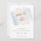 Casamento elegante Salve o cartão de Data com belos pinceladas em uma mistura harmoniosa de matizes rosas, cor-de-rosa-pincel e azuis com a frase "Salve a Data" em uma caligrafia escrita à mão graciosa e moderna. Atrativo de volta com lavagem de pincel. Estilo moderno e elegante minimalista. Nota: a tipografia não está em folha real, mas na impressão de preferencialmente em uma matiz de ouro. Parte da nossa coleção "Blue with Blush or Cinza Brush Strokes Wedding".