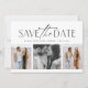 Este cartão de "save the date" simples, mas elegante, é a maneira perfeita de anunciar o seu noivado e casamento próximo para amigos e familiares. A frente deste "save the date" apresenta um tratamento de texto moderno em preto acima de uma colagem de três fotos. O verso é uma cor cinza carvão chique com espaço para uma mensagem personalizada, assinatura e um código QR para o site do seu casamento. Este "save the date" original da Lea Delaveris Design faz parte de uma coleção onde você pode encontrar mais cores e estilos. Ele também está disponível como um download digital de "save the date".