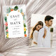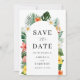 Um casamento elegante, exceto a data no tema tropical do verão, com folhas de palmeira pintadas manualmente, folhas de cor d'água, bananeiras, hibisco, plumeria, e uma bela foto do casal nas costas.