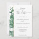 Este casamento moderno e simples de primavera ou verão Salvar a Data apresenta uma ilustração clássica e contemporânea de lindas folhas de cor aquática de eucalipto no lado esquerdo, realçada com uma bela borda falsa de ouro. Este cartão Salvar a Data faz parte da coleção "Casamento Elegante Eucalyptus", com itens coordenadores e totalmente personalizáveis para criar um pacote de casamento único.