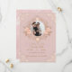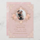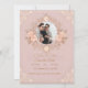 Este é um sofisticado design de cartão de casamento save-the-date que apresenta uma delicada coroa circular feita de rosas cor-de-rosa e folhagens douradas. A paleta de cores combina fundos cor-de-rosa suave com sotaques dourados metálicos. Floreios decorativos nos cantos e uma moldura sutil completam a composição elegante. O design geral sugere um casamento romântico e sofisticado com elementos inspirados no vintage.