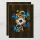 Composição do relógio de aço redondo com discagem numérica romana preta, decorado com engrenagens de ouro e latão, borboletas morfo azuis e lentes danificadas sobre fundo listrado castanho. Estilo Steampunk.