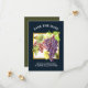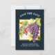 Um belo punhado de uvas vermelhas 3D é enquadrado por um quadro de borda quadrado branco e fino de cor dourada contra um fundo azul escuro que pode ser mudado para qualquer cor de sua escolha. Modelos brancos editáveis aparecem acima e abaixo do gráfico do ai para sua redação personalizada e o verso é uma linda floresta / verde-oliva que corresponde perfeitamente aos convites. Estes são ideais para qualquer fazenda de vinho; vinhedo; adega ou casamento country.