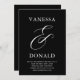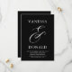 Casamento moderno salve o cartão de data apresentando um layout simples e mínimo com seus nomes e um computador elegante em um formato grande acima dos detalhes do evento. O tema de cor é branco sobre um fundo preto e pode ser alterado na ferramenta de edição de design.