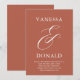 Casamento moderno salve o cartão de data apresentando um layout simples e mínimo com seus nomes e um computador elegante em um formato grande acima dos detalhes do evento. O tema de cores é terracotta e pode ser alterado na ferramenta de edição de design.