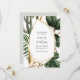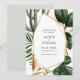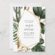 Convite Salve o Dia apresenta folhagem tropical com centro geométrico dourado moderno. Visual perfeito para casamentos de verão e eco modernos.