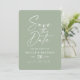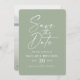 Verde Folha Simples com Casamento Fotográfico Script Salve As Cartões Data. Este design moderno, porém clássico, é minimalista e elegante com uma simples cor sólida e um belo texto de assinatura de caligrafia. Mostrada na nova via colorida. Também apresenta uma fotografia personalizada opcional do casal no verso. Ou simplesmente ocultar a camada para ter um fundo sólido. Para ver mais, procure as coleções de casamento de 2022 da Chic Paperie para ver todas as tendências de designs e cores de casamento para este ano.