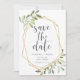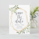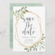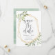 Um belo casamento verde e dourado salve as cinzas que contêm as letras que são enquadradas por uma falsa borda geométrica de ouro e folhagem verde clara, folhas e bagas brancas. Personalize com seus nomes, data do casamento e local, e adicione qualquer informação adicional, como seu site de casamento, ao lado oposto. Uma escolha moderna em um esquema natural de cores para boho, floresta ou casamentos com temas naturais em qualquer estação.