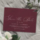Cartões salve a data formais com um script no estilo vintage. Fonte branca sobre fundo vermelho escuro.