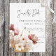 Celebrar a beleza do outono com nosso encantador casamento rústico com a água salve o cartão de data. Contra um fundo branco primitivo, um pedaço macio e sonhador de burgundy, vinho tinto e flores silvestres mauve cor-de-rosa, aliado a delicadas margaridas brancas, forma uma cena pitoresca de romance e elegância. A adição de verde-ouro de cevada adiciona um toque de calor e riqueza ao design, criando uma mistura cativante de cores. Esta carta exude a essência de uma terra maravilhosa da queda rústica, capturando o charme da recompensa da natureza em derrames de aquarelas moles. As flores silvestres simbolizam o florescente do amor, enquanto as margaridas representam pureza e inocência. Prepare-se para mesmerizar seus convidados com um design que os transporta para um mundo de encanto e beleza. As delicadas cores d'água criam uma atmosfera de serenidade e alegria, fazer seu casamento uma experiência realmente inesquecível. Coloque a palco para uma celebração do amor entre o esplendor da queda, e crie memórias queridas que durarão uma vida com este design verdadeiramente cativante. É parte do Rustic Red & Barley Watercolor Wildflower Suite criado pela Simply Farmhouse Press.