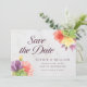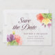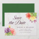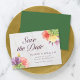 Este elegante cartão floral de "save the date" apresenta flores vibrantes com as palavras "save the date" em uma fonte moderna, tudo contra um fundo de mármore pálido na frente e um verso de cor verde.