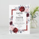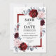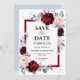 A ardósia cor-de-rosa bicolorosa, o casamento floral, salvo o cartão de data com buquê elegante de burgundy, vinho, azul empoeirado, pincel, rosas e botões de flores de pénia, folhas de eucalipto verdes empoeiradas e quadro neutro geométrico de falso vermelho. Entre em contato comigo para obter ajuda sobre a personalização ou se você precisar de outro produto com este design