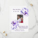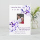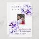Design apresenta foto do casal no centro rodeado por flores violetas. Acima da foto, lê-se: "Salve a Data!" seguido da data do casamento em números. Abaixo está o texto personalizável que exibe a mesma data que a saída escrita. Uma breve mensagem do noivo e do quarto aparece abaixo. Na cidade mais baixa e no estado do casamento é exibido. Todo o texto está na fonte do inglês antigo. Projetado para coordenar com a "Suíte de Casamento Católico para Violetas Elegantes".
