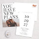 Avise aos seus convidados que agora têm grandes planos para o dia do seu casamento. Este único cartão com fotos para Salvar a Data apresenta um título ousado e engraçado que diz "Você tem novos planos" junto com uma foto personalizável. O verso inclui um texto grande com a data do casamento e um local para adicionar texto mais detalhado, incluindo os nomes dos casais, a data do casamento, a localização e um site de casamento.