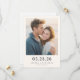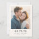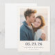 This wedding save the date features a minimalist and contemporary design with a central photograph of two individuals embracing, capturing an intimate moment. The color palette includes soft, natural tones with muted blues and whites, set against a warm beige background that enhances the bright and airy feel. Clean, modern typography in bold black letters highlights the date and location details, ensuring clarity and elegance. The overall layout is balanced, guiding the viewer's eye seamlessly from the affectionate photo to the essential information below, creating a harmonious and inviting presentation perfect for celebrating love and commitment.