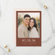 This wedding save the date features a warm, intimate photo of two individuals set against a softly blurred outdoor background with earthy tones. The design is framed by a rich maroon border and includes clean, modern typography for customizable details like dates and names. The minimalist layout emphasizes simplicity and clarity, creating an inviting mood perfect for celebrating love and anticipation. Ideal for couples looking to share their joyous news in a stylish and heartfelt way.