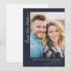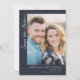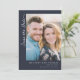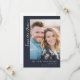 This wedding save the date card features a modern, minimalistic design with a large photo placeholder at the top showcasing two individuals in close proximity. The deep navy blue background contrasts beautifully with the warm tones of the photograph, creating an elegant and inviting atmosphere. The text is arranged neatly below the image, using clean sans-serif fonts for names and dates, and a cursive script for "Save the Date," adding a personal touch. The overall layout emphasizes clarity and sophistication, making it perfect for couples looking to announce their upcoming nuptials with style and simplicity.