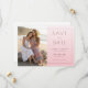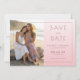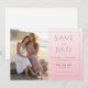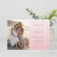 This wedding save the date card features a split design with a serene beach photograph on the left, capturing two individuals sitting on a log during sunset. The right side showcases elegant text set against a soft pink background, using a muted maroon serif font for a formal yet inviting look. Customizable fields allow for personalization of names and details, while the overall mood exudes warmth and anticipation, perfect for celebrating a special life moment. The realistic representation style emphasizes authenticity, making it an ideal choice for couples planning their big day.