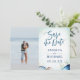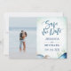 A caligrafia moderna das aquarelas economiza a data com conchas, estrelas, algas e uma bela âncora. Fundo de cor azul-lacrimogênea. Combinação de fontes elegante. Perfeito para o casamento na praia, ou casamento no estilo náutico.