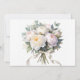 A delicate watercolor illustration of white and pink peonies with eucalyptus leaves arranged in a corner design. The flowers feature detailed petals with subtle pink undertones and golden stamens in their centers. The eucalyptus leaves are rendered in various shades of sage green, with elongated oval shapes and natural veining. The leaves are arranged in graceful curved branches that extend from the top right and bottom left corners of the composition. The flowers are painted with soft, translucent watercolor techniques, creating gentle gradients and subtle shadows. The illustration is set against a pure white background, creating a clean, elegant aesthetic. The arrangement creates a balanced, symmetrical design with the flowers and foliage distributed evenly across the corners of the frame.