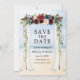 Elegante Casamento Canopy Watercolor Burgundy Marsala Anúncio de Noivado Floral de Casamento Salve O Cartão de Data inclui belos rosas de burlagem, rosas rosa, flores vermelhas e flores azuis. O arco da copa do casamento da madeira inclui vegetação botânica em um fundo oceânico azul-marinho de praia arenosa.