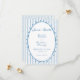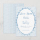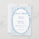 This whimsical wedding save the date card features a soft blue, playful oval frame against a classic blue and white striped background. Perfect for a wedding with a preppy or coastal aesthetic, this charming design provides a sweet, hand-painted look for your special celebration. Created by Simply Farmhouse Press.
