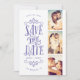 Anuncie sua data em estilo com esta gravação de 3 fotos no cartão de data com tipografia em negrito. O reverso apresenta um padrão distribuído e uma foto e texto adicionais.