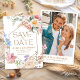 This floral save the date invitation includes space for a personalized couple photo, making it a heartfelt and memorable announcement your guests will love. The pastel color flowers and foliage frame the design gracefully, blending modern elegance with a whimsical botanical style. Ideal for outdoor weddings, backyard ceremonies, vineyard celebrations, bridal showers, engagement parties, and summer soirées, this design sets the tone for a warm and joyful event.