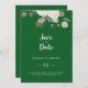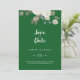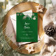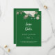 Este floral de inverno no casamento verde esmeralda salve o cartão de data é perfeito para um elegante casamento de Natal. O simples design apresenta flores brancas com verde-inverno e folhas de eucalipto, com um sentimento moderno do país.
