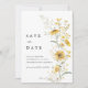 A romantic yellow sunflower and wildflower photo save the date card featuring soft watercolor florals and an elegant botanical layout. The delicate golden yellow blooms frame a warm engagement photo beautifully, creating a timeless garden-inspired design.
