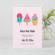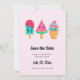 Salve a placa de data com uma ilustração de 3 tratamentos de sorvete diferentes. Um picolé azul-esverdeado com gotas de morango e salpicadores coloridos. Um picolé de melancia. Um cone com camadas deliciosas de sorvete em rosa e menta. Todos com sorrisos kawaii fofos.