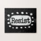 O texto em negrito com "Resistir" é centrado sobre um fundo preto. O texto preto se senta em um retângulo branco com grandes pontos brancos texturizados ao seu redor, fornecendo um contraste lúcido contra o plano de fundo de cor sólida.