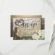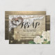 Modelos de Cartão de Resposta / Responda por Favor para Casamento Rústico no Estilo Country - Casal com Antiga Ferradura em Coração com Nó de Corda e Renda Branca, Flor de Hydrangea, Luzes de Corda e Tecido de Sarja em Fundo de Madeira de Celeiro Antigo.
