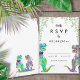 Um cartão de resposta RSVP de casamento com dinossauro divertido e divertido, com noiva e noiva de dinossauro e eucalipto verde para trazer alegria Jurássica pré-histórica para o dia do seu casamento. Caligrafia tipográfica branca moderna com fácil personalização de modelos. Noiva T-Rex exclusiva e noiva em cores psíquicas esmeradas, com coloração d'água de folhagem botânica, obra de arte original da artista Catherine Sweetman Ideal para a recepção ou janto de ensaio no dia do casamento. A suíte de casamento combinando inclui tudo o que você precisará na sua divertida viagem de casamento