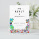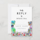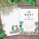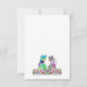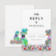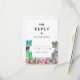 Traga diversão e alegria para o seu dia de casamento, com este colorido cartão de cerimônia de entrega de RSVP de Dinossauro com noiva e noiva T-Rex psicodélica num prado de flores silvestres pré-históricas coloridas. Caligrafia tipográfica branca moderna com fácil personalização de modelos. Nosaurus Rex noiva e noiva únicas com cor d'água e arte floral original de verão da artista Catherine Sweetman Ideal para a recepção ou janto de ensaio no dia do casamento. A suíte de casamento combinando inclui tudo que você precisará na sua divertida viagem de casamento