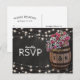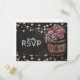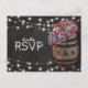 Cartões de resposta de casamento country elegante com um fundo de quadro-negro preto rústico, luzes cintilantes, rosas rosa e flores gypsophila, um barril de madeira de adega com suas iniciais e um pedaço de corda amarrada.