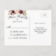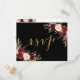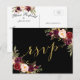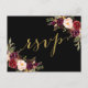 Cartão postal de resposta de casamento em borgonha com fundo preto e efeito de folha dourada em água-forte com ilustrações florais em estilo vintage chic. Elke Clarke © Outras cores disponíveis em www.zazzle.com/monogramgallery. Um rsvp de letra manuscrita simples, porém versátil, para casamentos ou outras ocasiões especiais, como jantares de ensaio, chá de casal, celebrações de aniversário de casamento. A folha dourada é um efeito de foto impressa.