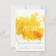 Placa de resposta/resposta RSVP de abstrato amarelo moderno com cor d'água apresentando um esplaxa de tinta aquosa pintada manualmente com textura em tons de amarelo e laranja queimado, folhas de maple em branco com veias amarelas claras e texto em branco e cinza. Este design de casamento elegante e na moda é um modelo perfeito para o seu primavera, verão ou outono/outono. Note que esta é apenas uma imagem de aquarela e não textura real. Para obter melhores resultados, escolha feltro ou outro papel.