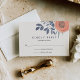 Projetado para combinar com nossa coleção de convites para o casamento de Peach Poppies, nosso cartão de resposta floral chic e romântico apresenta um spray de flores de papoila em pêssego de coral cercado por folhas e botões em cinzas azuis sujas e poeirentas e verdes caçadores desbotados.