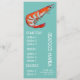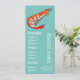 Um modelo de menu colorido e fofo para um restaurante moderno de frutos do mar ou jantar temático de peixe e frutos do mar. Este menu fofo tem uma ilustração original fofa de um camarão contra um fundo personalizável de tema de praia aqua azul. O texto pode ser personalizado para atender às suas necessidades.