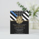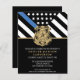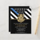 Este design apresenta uma bandeira da polícia com listras pretas e brancas, e uma fina faixa azul de linha também. O crachá da polícia e o texto do ouro estão acima de todos os detalhes do partido para os detalhes do polícia aposentado, xerife, capitão ou chefe do partido aposentado.