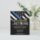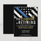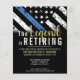 Este design apresenta uma bandeira da polícia com listras pretas e brancas, e uma fina faixa azul de linha também. O texto "A lenda está se aposentando" do ouro fica acima de todos os detalhes partidários para os detalhes do polícia aposentado, xerife, capitão ou chefe do partido aposentado.