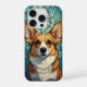 Ilustração digital encantadora de um Pembroke Welsh Corgi com orelhas grandes contra um fundo de mosaico de vidro colorido azul, transmitindo calor, alegria e companheirismo leal para uso em pet, design e editorial.