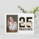 Esta imagem apresenta um design de convite para a graduação de na moda. No lado esquerdo, há uma área de retrato personalizável onde qualquer foto do formando pode ser adicionada, adicionando um toque pessoal ao convite. Do lado direito, o texto "25 vinte FORMANDOS" é apresentado em caracteres negros e dourados, indicando o ano de graduação de 2025. Este convite é elegante e comemorativo, perfeito para marcar um marco significativo.