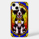 Ilustração mostrando um detalhado retrato de cão rodeado por um fundo vívido de vidro manchado com cores e padrões ricos, enfatizando a criatividade e a arte.